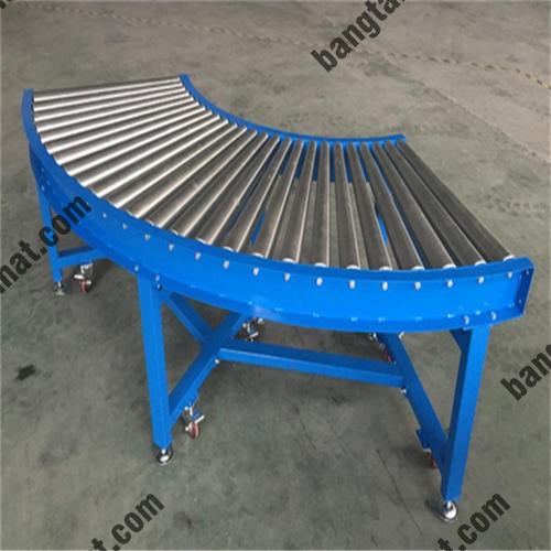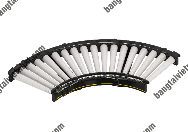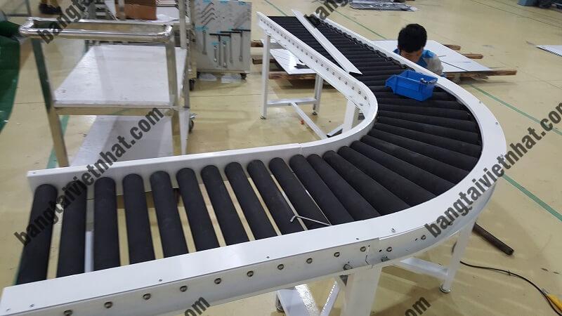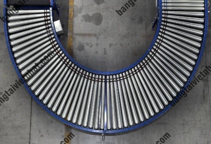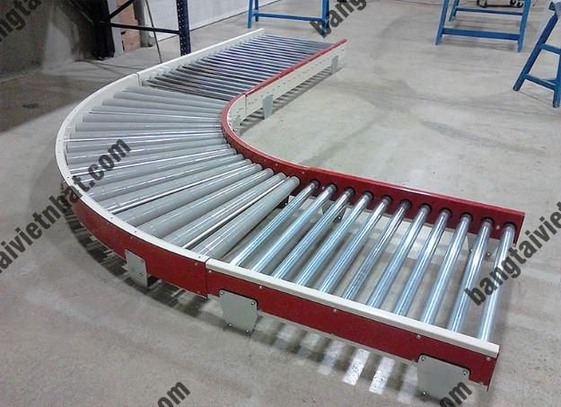 - Băng tải con lăn góc cong là loại băng tải chuyển hướng di chuyển sản phẩm với góc độ 450; 600, 900, 1800. Được chia ra làm 2 loại có động cơ và không có động cơ.
