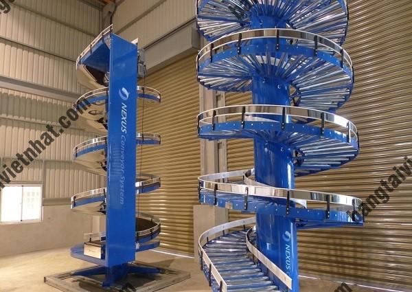 Dàn con lăn xoắn ốc: Phục vụ vận chuyển hàng hóa từ nới cao đến thấp nhờ nguyên lí trọng lực. Phù hợp cho các vị trí nhà xưởng hẹp ít không gian diện tích.